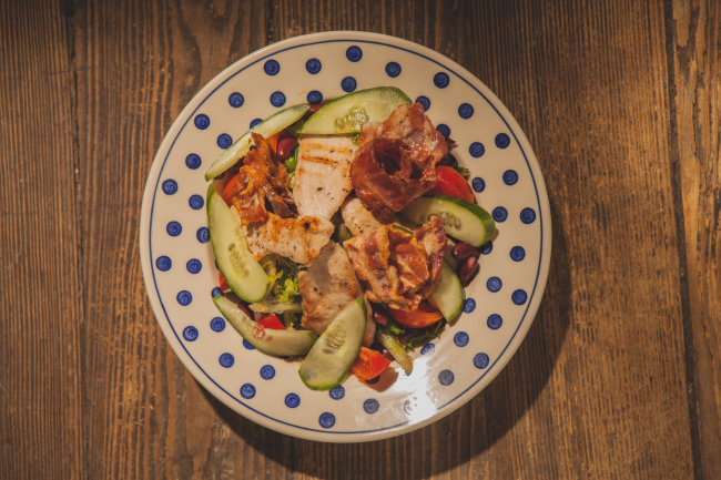 Miks sałat, grillowany kurczak i boczek, pomidor, ogórek