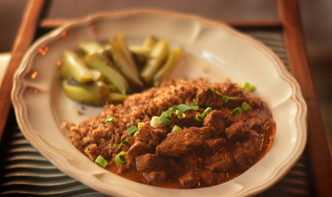 Gulasz wołowy, kasza gryczana, ogórek kiszony