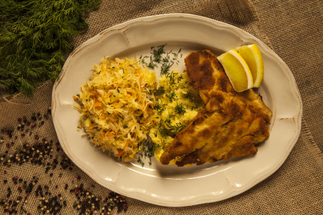 Sola smażona, ziemniaki gniecione, surówka z kiszonej kapusty