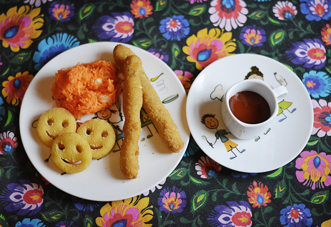 Paluchy z kurczaka, bużki ziemniaczane,surówka z marchewki